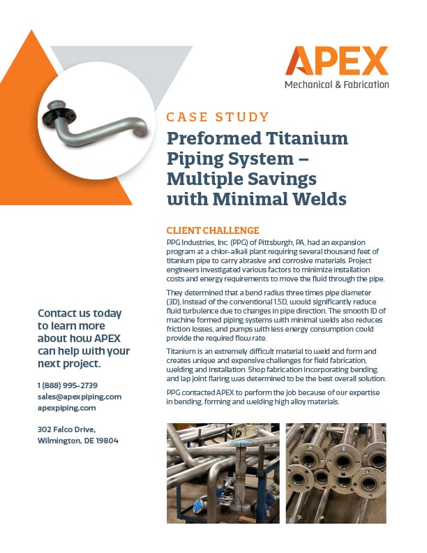 PPG Industries, Inc. (PPG) had an expansion program at a chlor-alkali plant that required APEX’s expertise in bending, forming, and welding high alloy materials to install and move corrosive fluid through several thousand feet of titanium pipe. Since titanium is difficult to weld and form, PPG faced unique and expensive challenges that APEX overcame with specialized equipment and procedures.